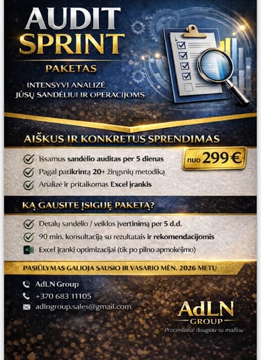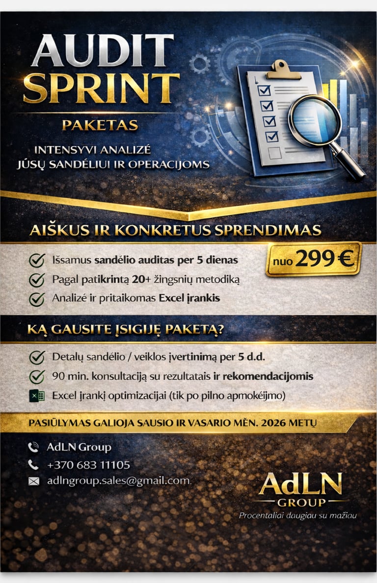 Audit Sprint – tai struktūruotas, trumpalaikis verslo procesų, sandėlio ir operacijų auditas, skirtas B2B įmonėms, kurios nori aiškiai suprasti savo dabartinę situaciją prieš priimdamos sprendimus. Ši paslauga ypač aktuali augančioms įmonėms, dirbančioms su sandėliavimu, tiekimu ir e-commerce procesais, kai jaučiamas neefektyvumas, bet nėra aišku, kur slypi pagrindinės problemos.